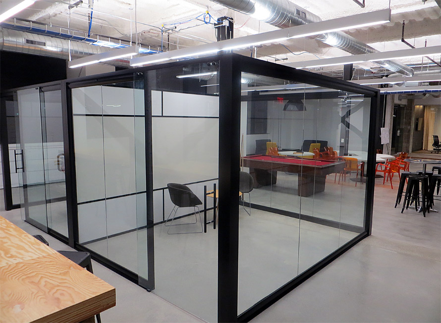 The FLEX series can create meeting spaces by combing glass wall panels and vinyl wrapped gypsum panels. With its flexibility and versitility to accommodate the modern workspace, this system can mix varying materials to design an active glass wall office. The glass can be designed to be double pane for superior acoustical performance. The wall system is re-configurable to accommodate changing needs.